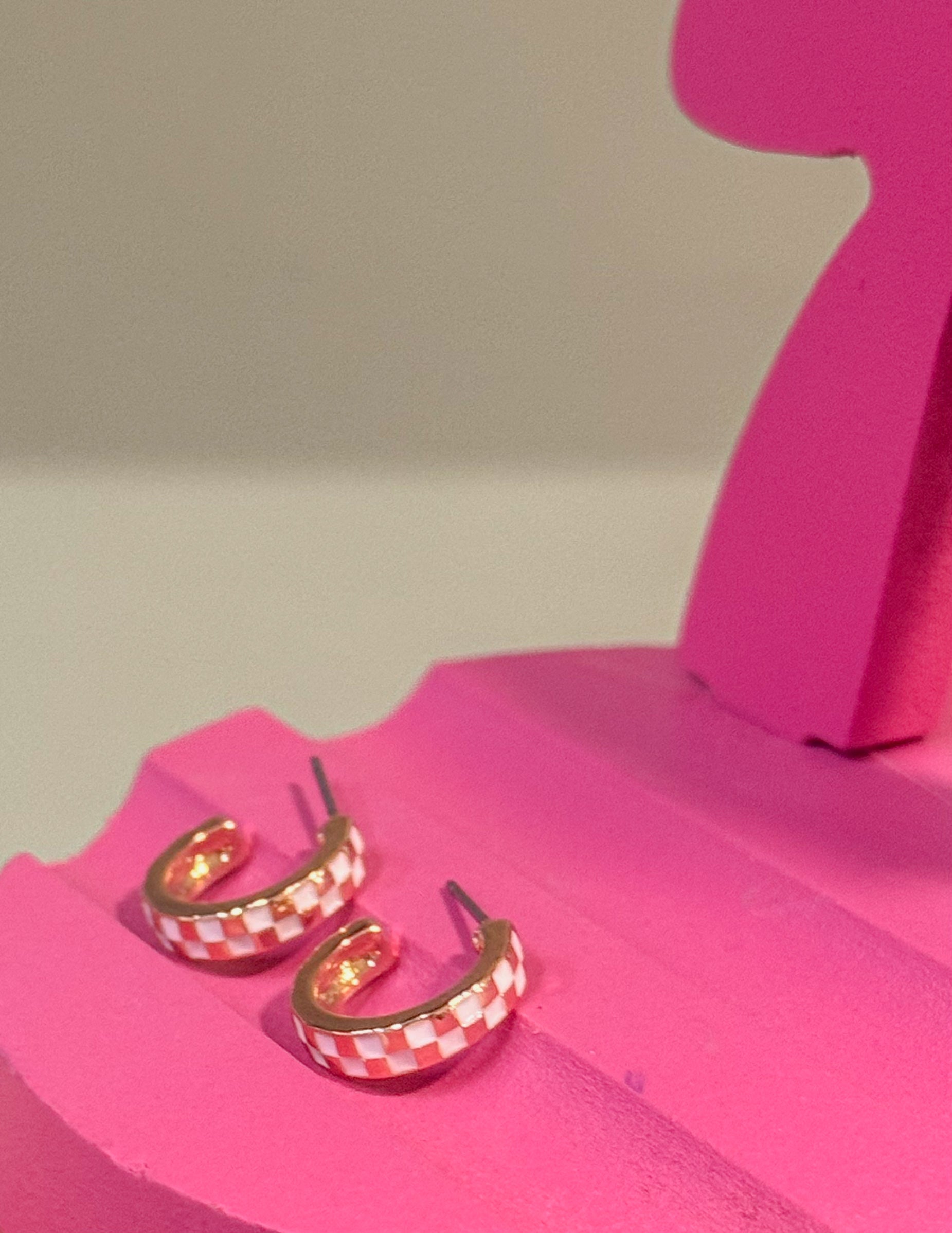 Add a little polish to your everyday look with our Mini Checkered Gold Huggies. Featuring a crisp white checkered detail set in radiant gold, these petite hoops are the perfect mix of modern and timeless. Lightweight and easy to wear, they hug the ear comfortably for an effortless, put-together finish — whether you’re headed to brunch, the office, or date night.