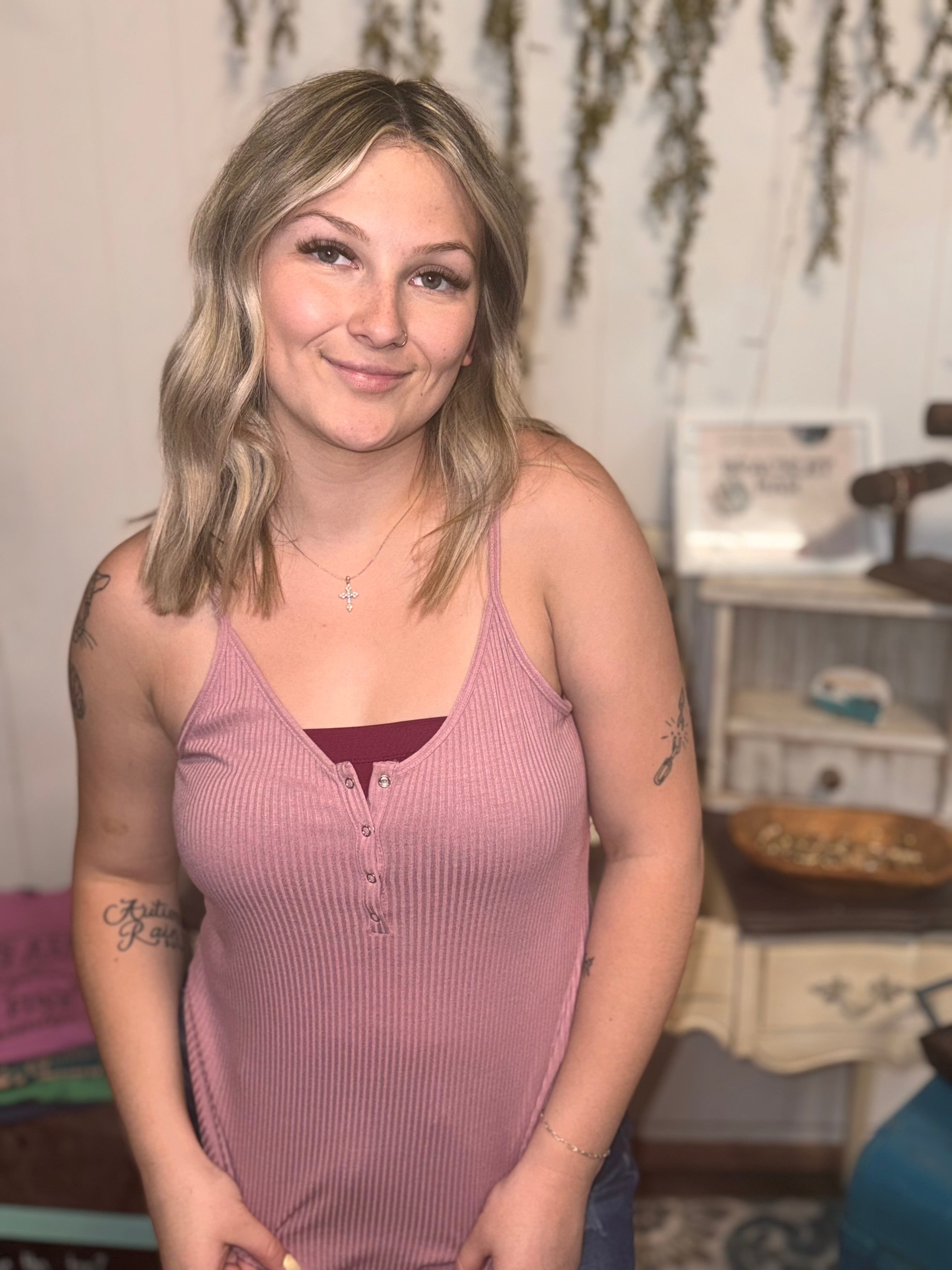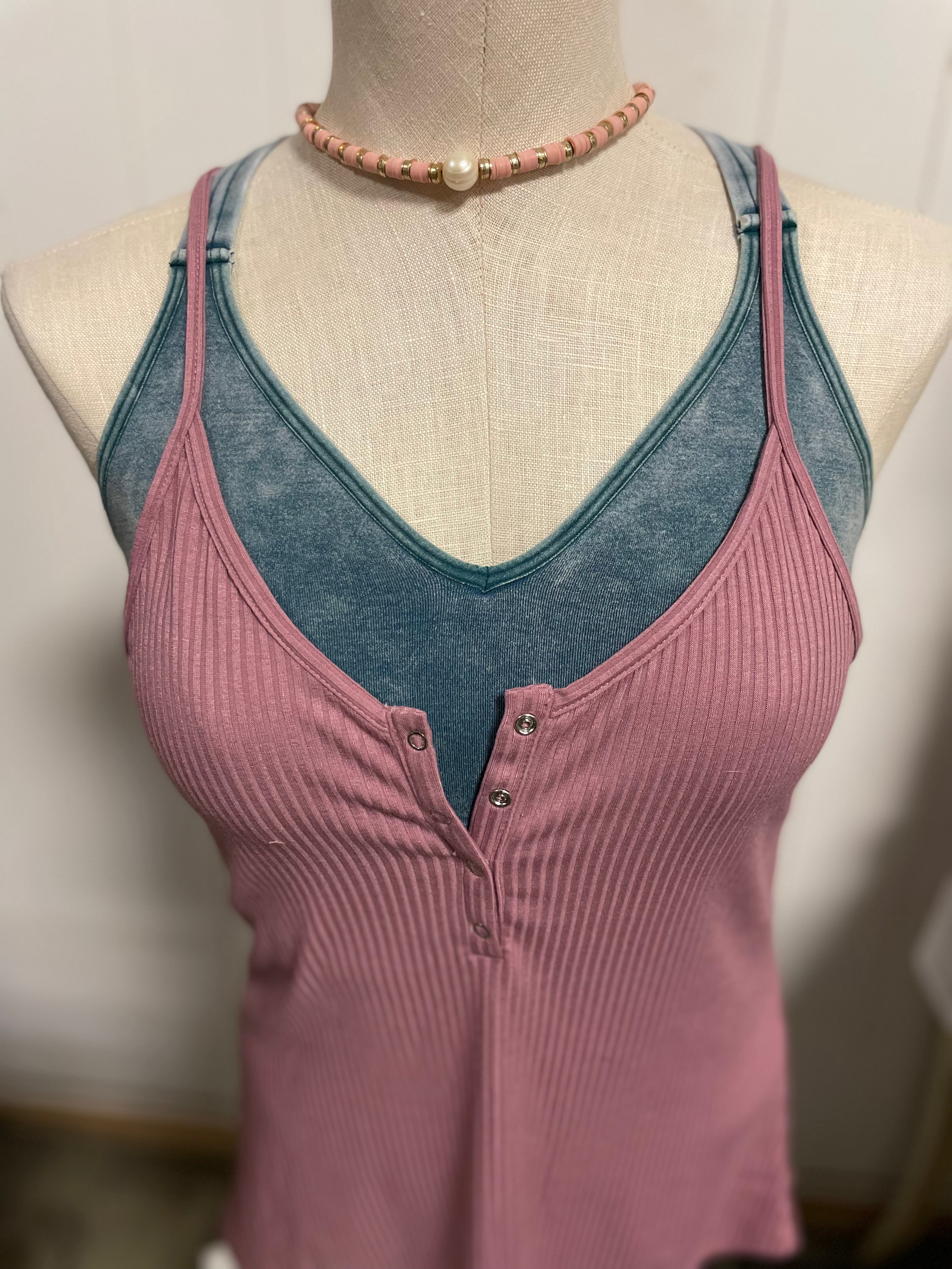 We have just the item you're looking for - a ribbed half snap button closure cami top. This top is made of a ribbed fabric for added texture and style, and features a snap button closure down the front for a secure fit. It's the perfect addition to any wardrobe!