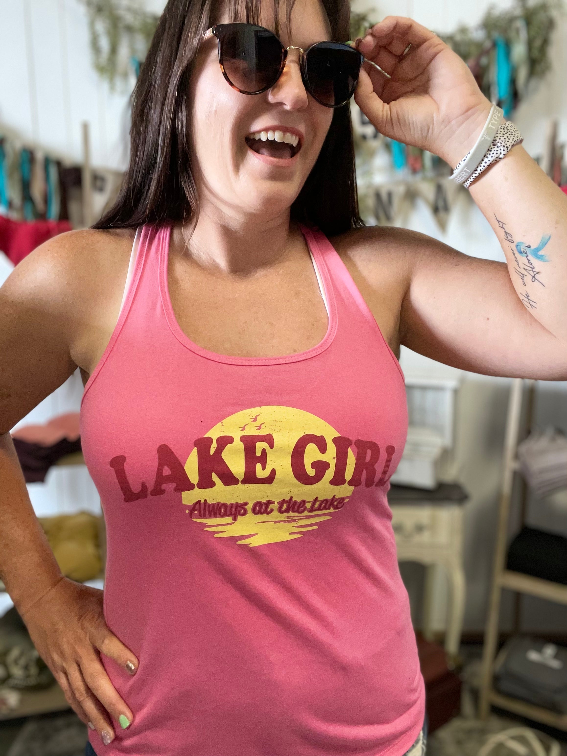 This playful pink racerback tank features a feminine fit and a charming "always at the lake" graphic with a serene sunrise over water. Perfect for lake days or casual outings, it blends comfort with a love for lakeside vibes.