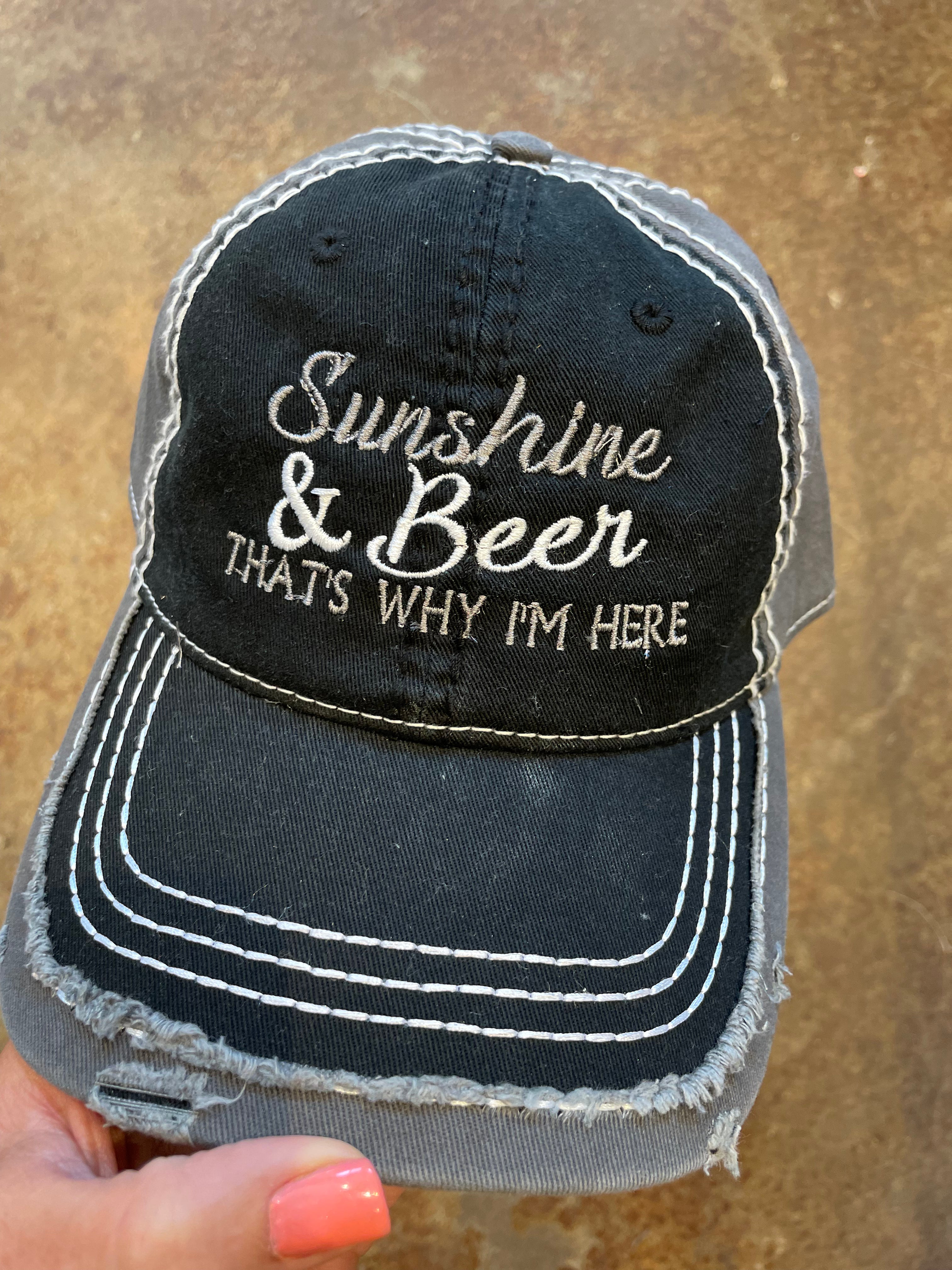 A little sunshine and beer is all you need to make your day great! That's why you'll be wearing this "Sunshine & Beer that's why I'm here" hat! Perfect for a day in the sun, or a night in the pub - it's practically summertime all year round!