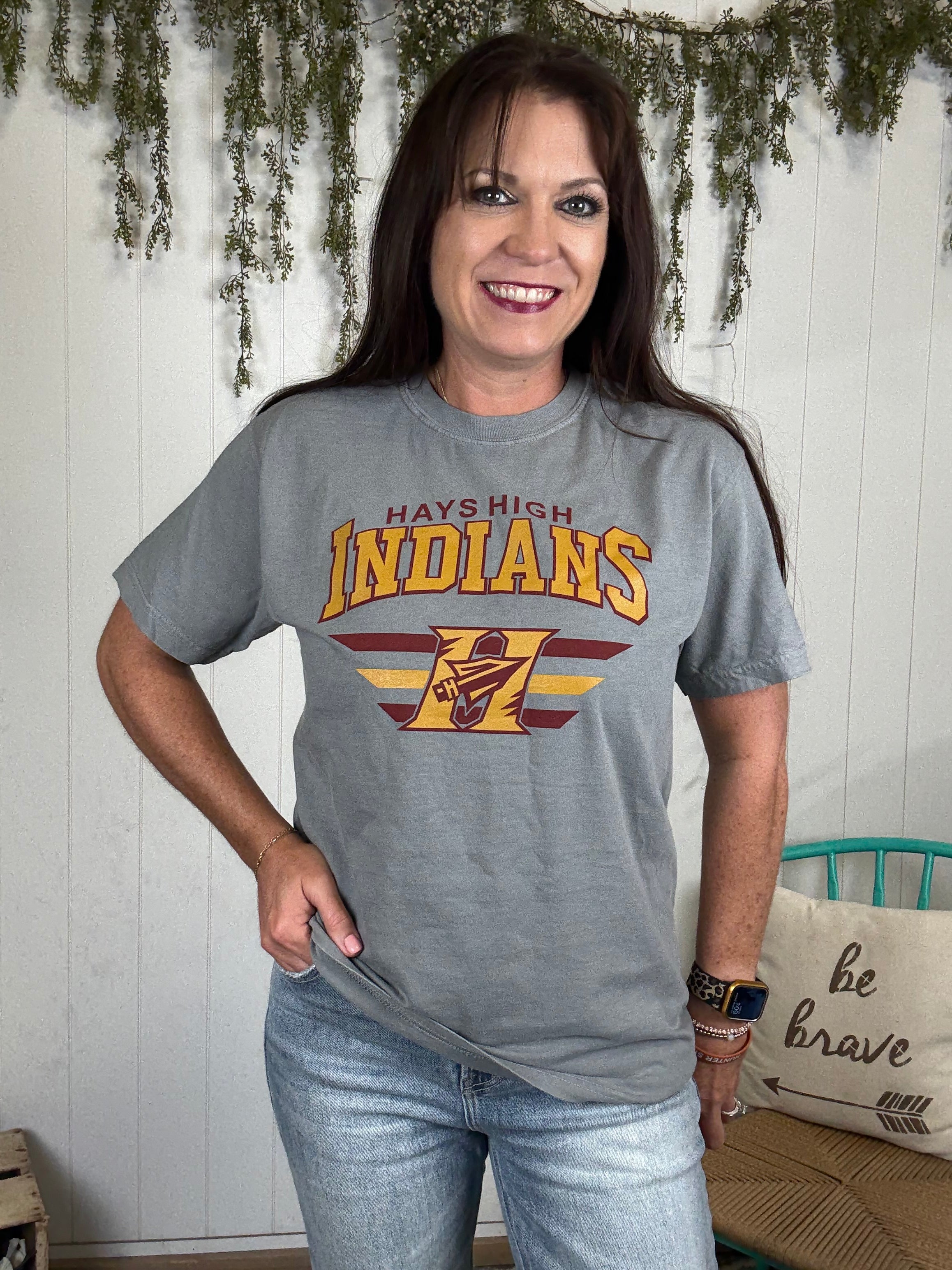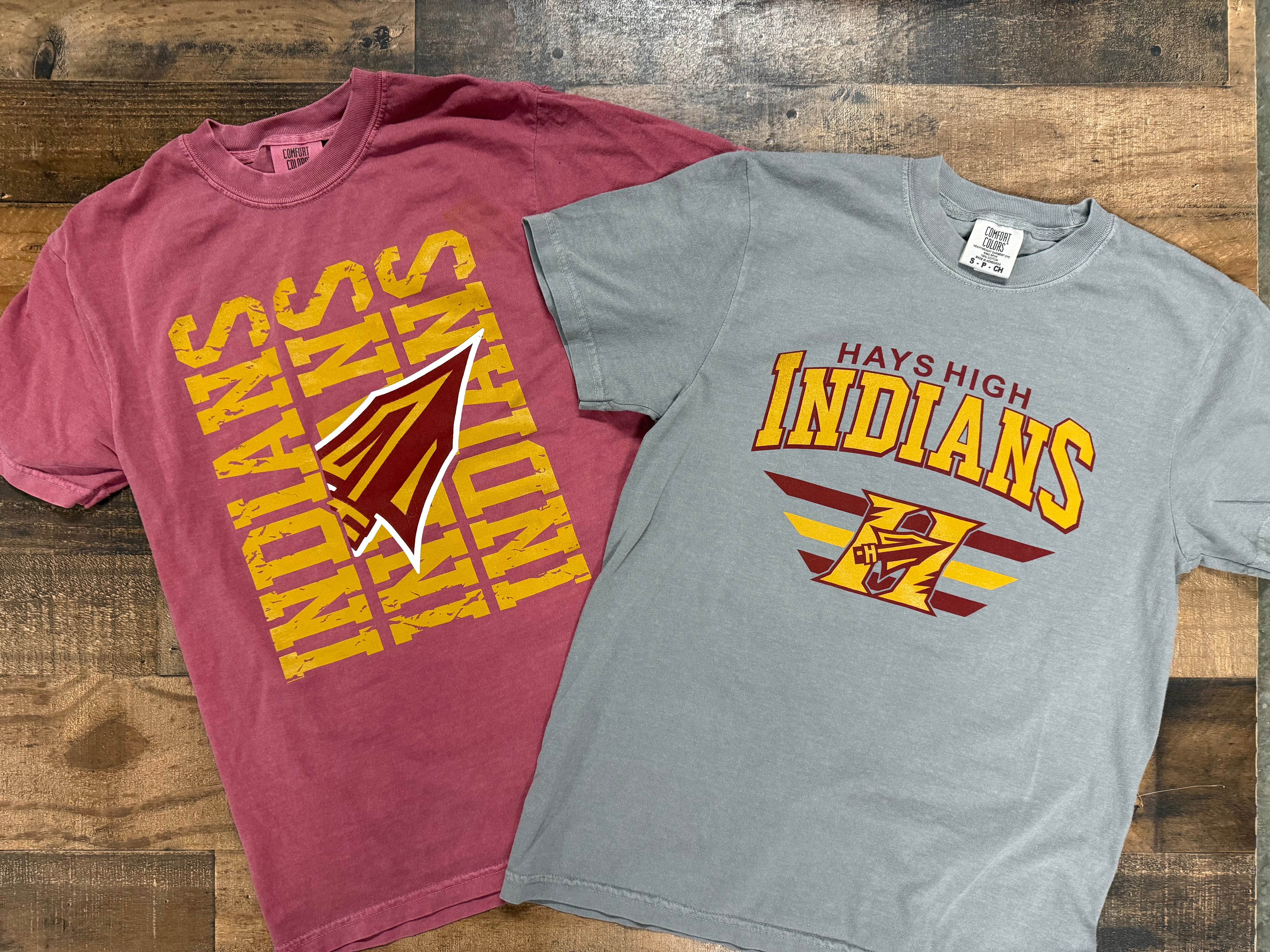 Cheer on the Hays High Indians in style with this brick-colored Comfort Colors tee! One of the few places offering HHS merch in town, this one-of-a-kind shirt lets you support local high school sports while being comfortable. Perfect for game days or everyday wear—go Indians!