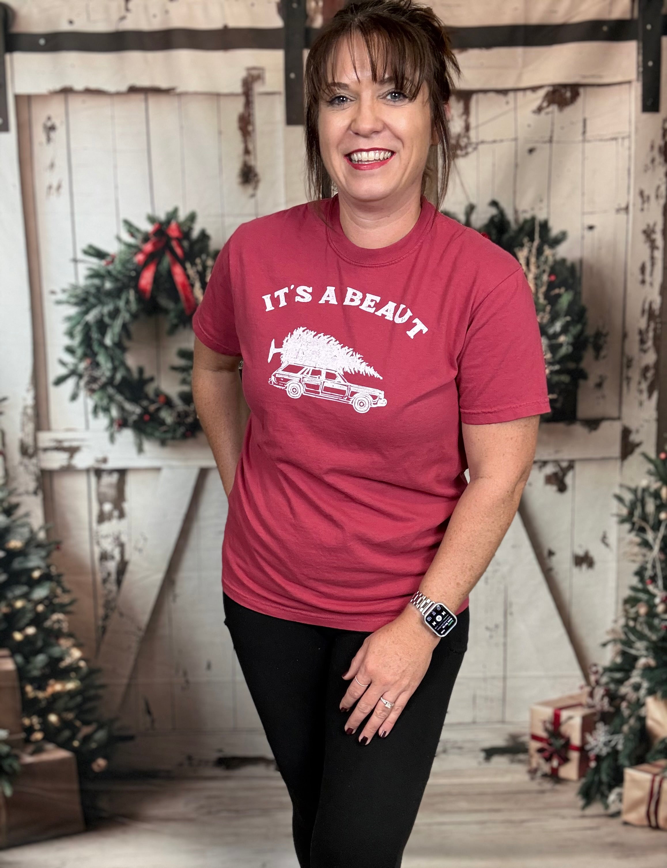 Get ready for the holidays with our It's a Beaut Tee! This comfortable red Comfort Colors tee is perfect for festive movie nights. With a touch of humor, it's sure to be a hit with friends and family.