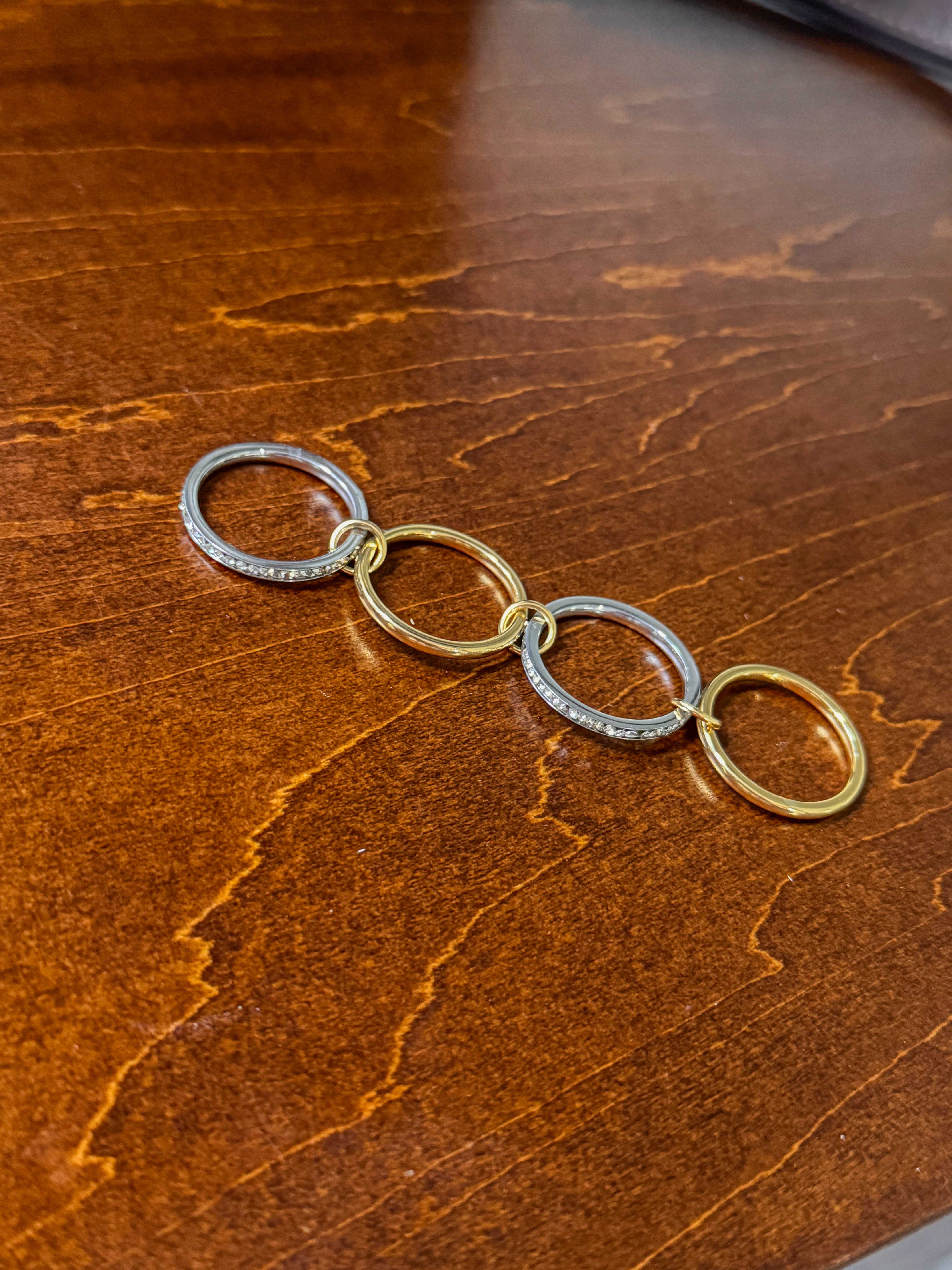 All the layered look — none of the stacking hassle. The Effortless Layered Stack Ring features four connected bands in a mixed gold and silver finish, linked together for a perfectly styled, dimensional look. Designed to give you that curated, stacked vibe in one easy piece, this ring blends polished shine with modern edge. The mixed metals make it versatile enough to pair with all your favorite jewelry — no matching required. An everyday statement that truly lives up to its name.