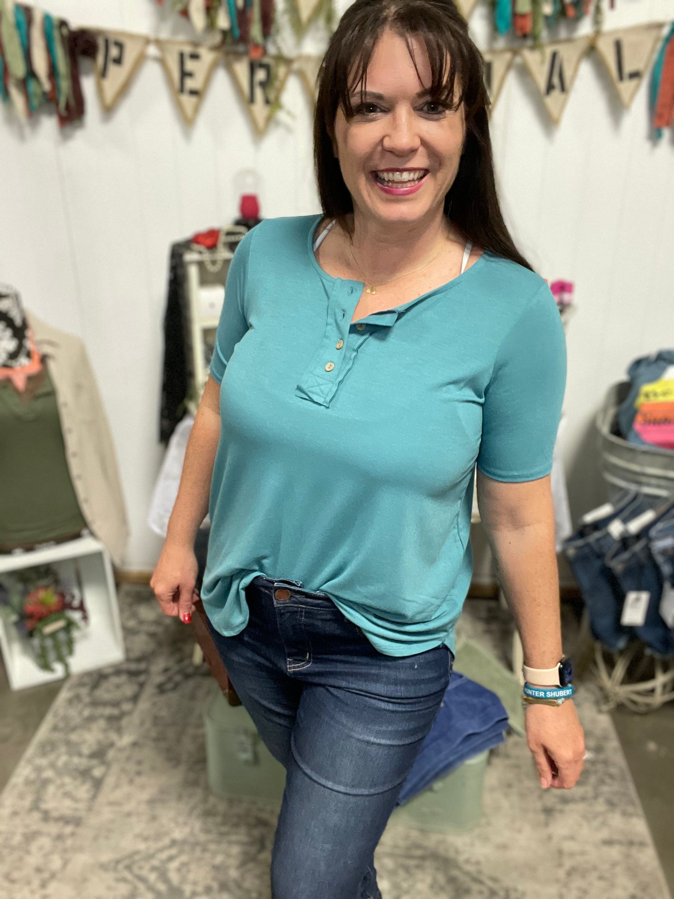This short sleeve button down top is crafted from a blend of 57% polyester, 38% rayon, and 5% spandex, providing a relaxed fit and a buttery soft feel.