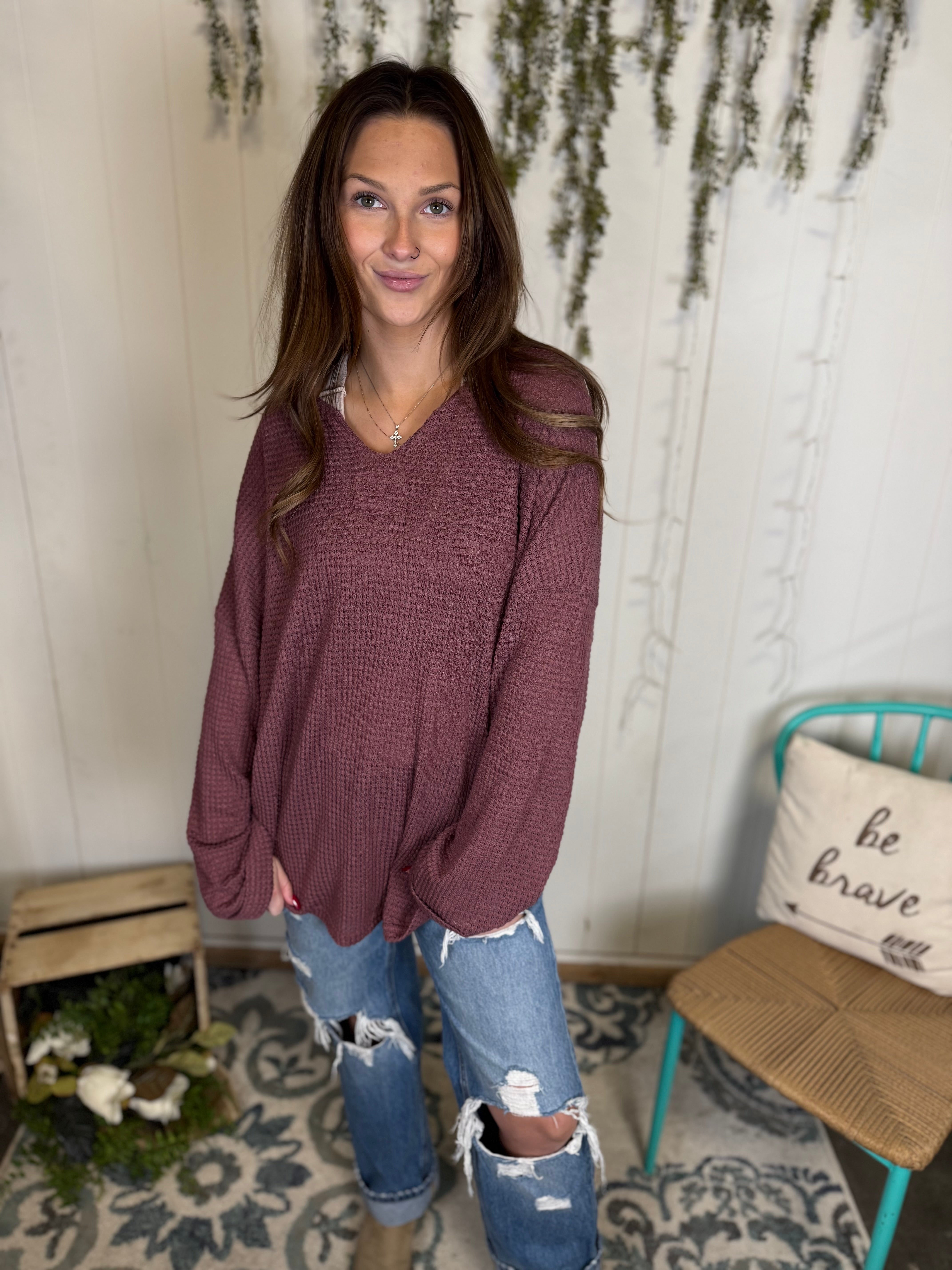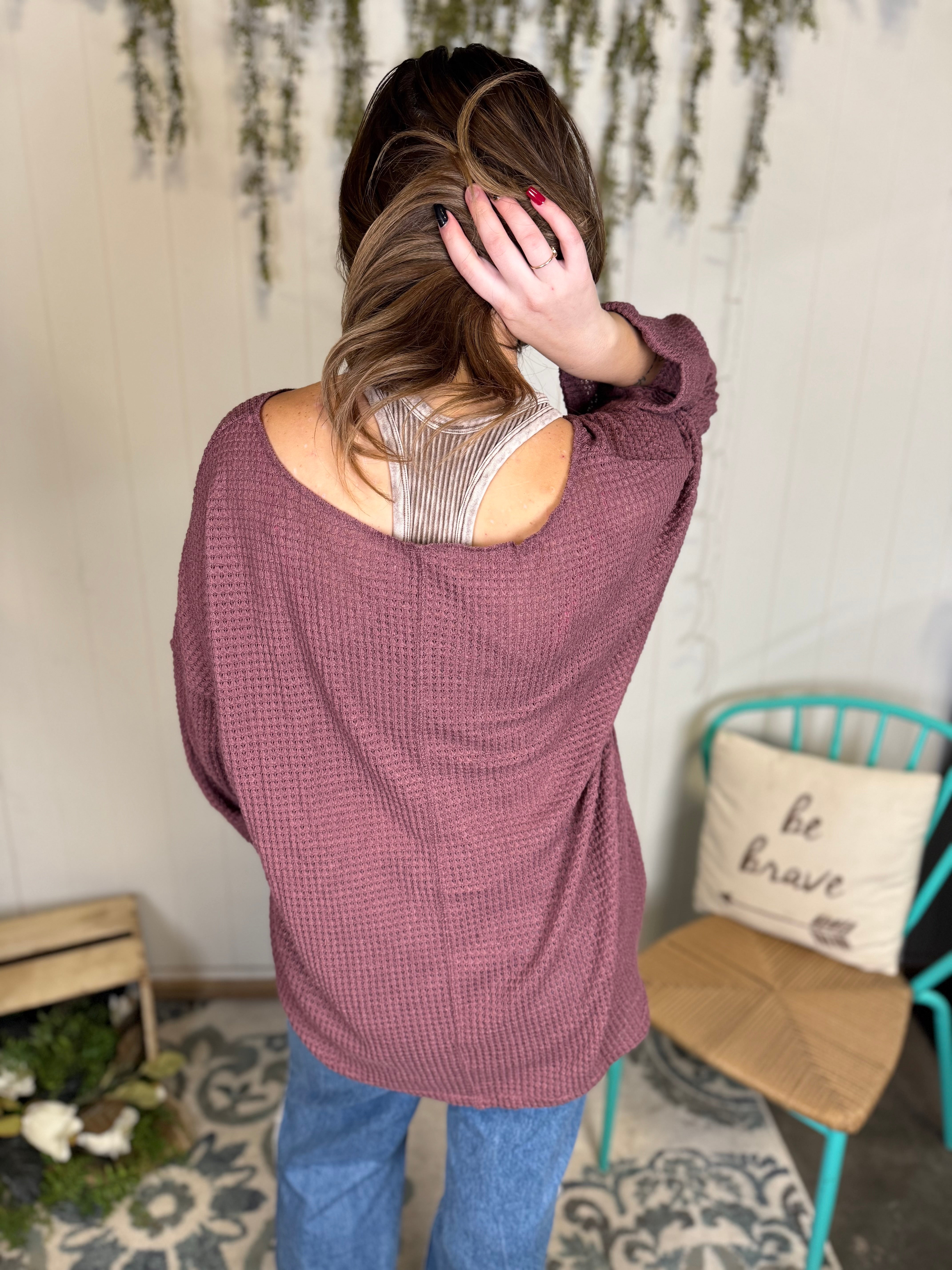 Wrap yourself in effortless comfort with our Plum Haven Waffle Knit Sweater.