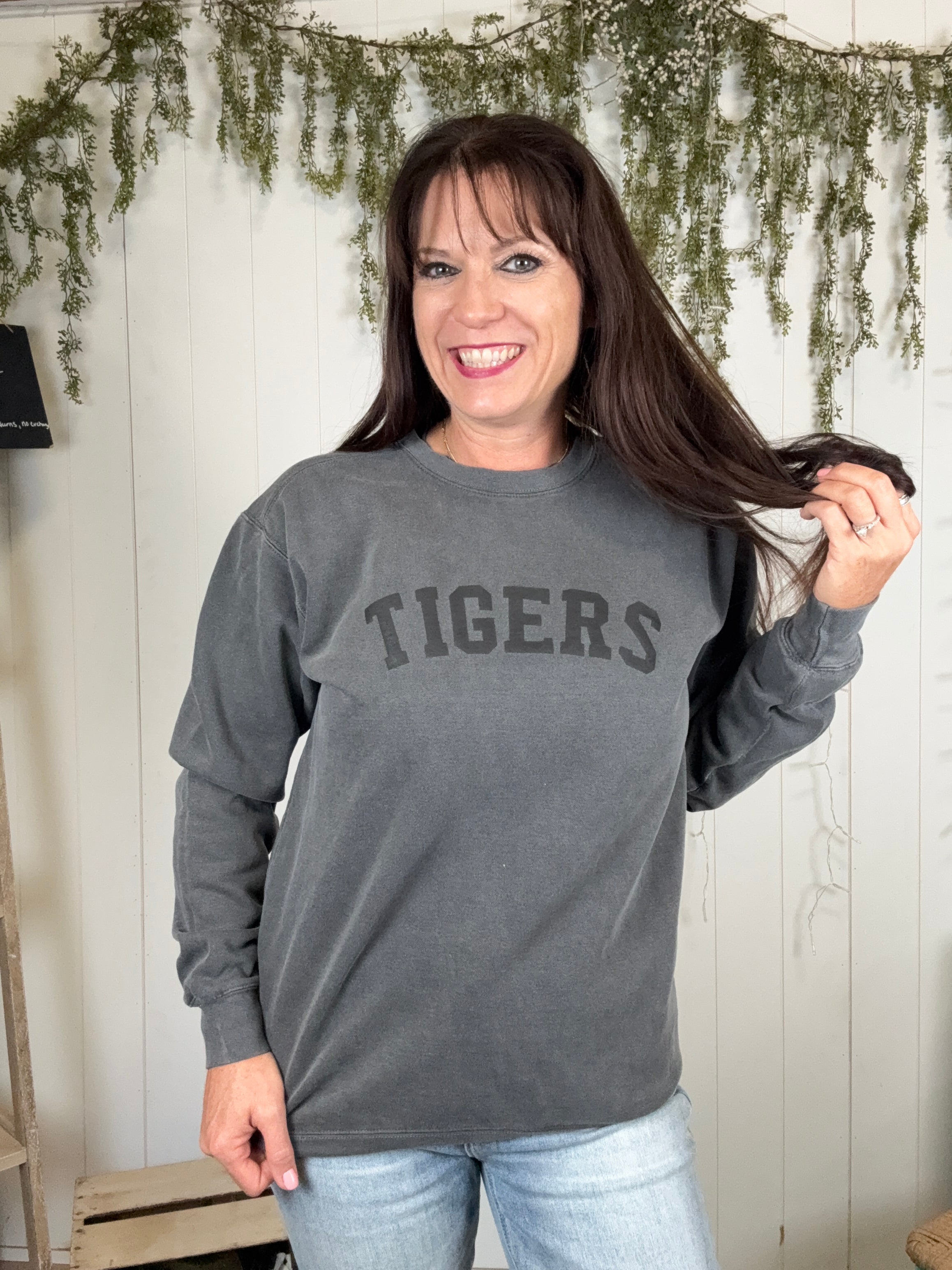 Cheer on the FHSU Tigers in style with the Tigers Puff Crewneck! This pepper-colored crewneck offers a relaxed, slightly stiff fit—perfect for those who like a little structure. Want to go big and cozy? Just size up for that oversized, snuggly feel. The black puff ink print pops proudly, making it clear where your loyalty lies. Officially licensed and ready for fall tailgates or school days, it’s your new favorite way to show spirited support with a playful edge!