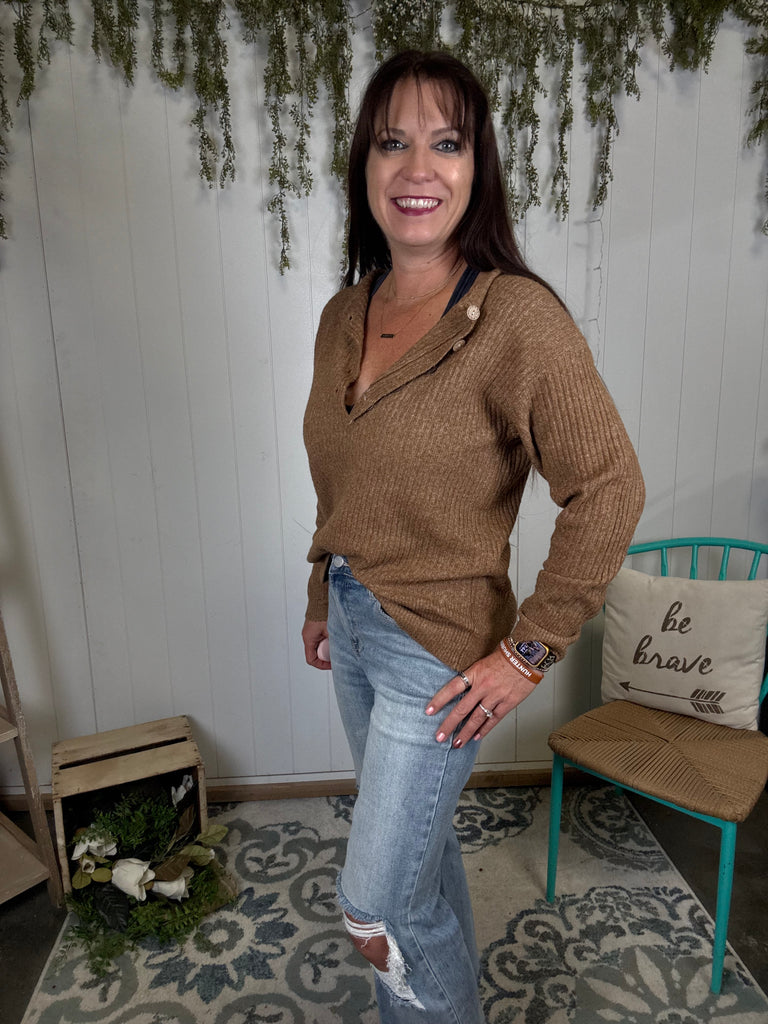 Cozy meets chic with this Buttoned Sweater Knit Top — unbelievably soft and feather-light for easy layering. In person, its rich brown hue really shines, making it a must-have for your fall wardrobe. The playful button details at the neckline add a little extra charm while keeping it casual. Perfect for those crisp autumn days, this top transitions effortlessly from warm afternoons to cool evenings. Embrace fall in style and comfort!